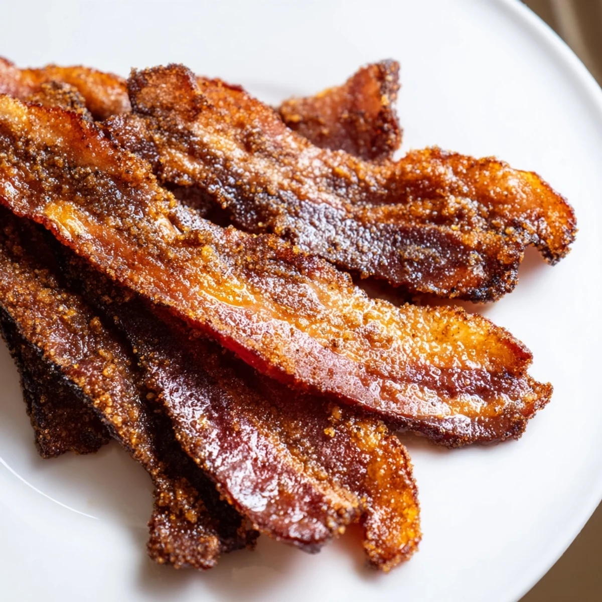 Coat bacon slices evenly with the brown sugar and spice mixture, then bake on a wire rack at 400°F for 30-35 minutes, allowing fat to render and sugars to caramelize deeply.