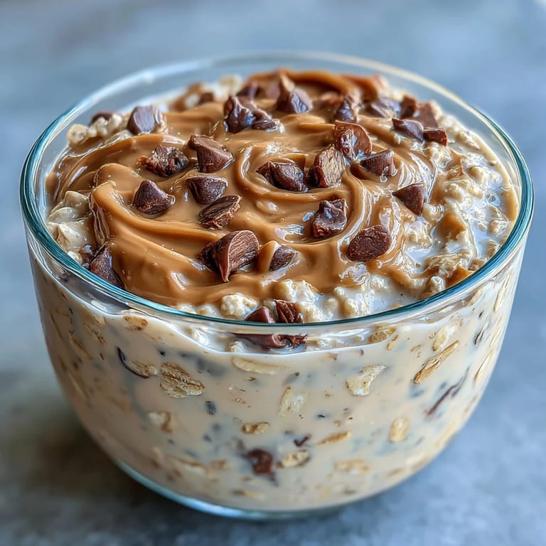 Save to Pinterest The beauty of overnight oats lies in their simplicity. Rolled oats absorb the milk and yogurt as they rest in the refrigerator, transforming from dry grains into a thick, luscious base with a texture somewhere between porridge and pudding. Chia seeds add body and a gentle nutritional boost, while vanilla extract ties everything together with a warm, fragrant note. In the morning, a quick stir and a few carefully chosen toppings — sliced bananas, a drizzle of peanut butter, a scattering of extra chocolate chips — turn a humble jar into something truly worth getting out of bed for.