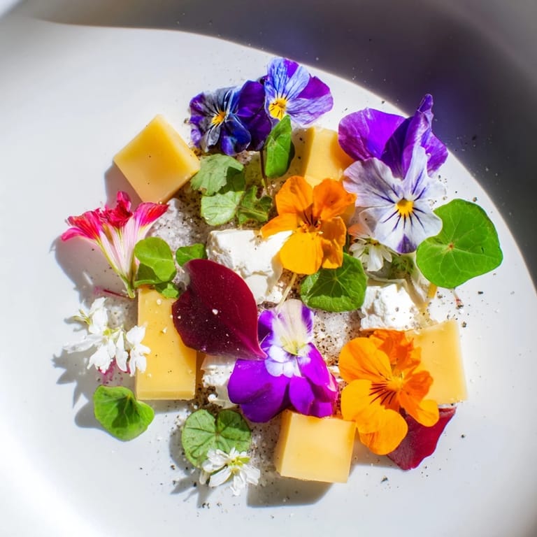 Save to Pinterest I discovered this dish on a Saturday morning at a farmers market, standing in front of a vendor's explosion of edible flowers, each one more delicate than the last. The vendor casually mentioned hiding cheese beneath them, and something clicked—the idea of turning a simple cheese board into a moment of discovery. Now whenever I set this out, I watch guests lean in with genuine curiosity, their hands hesitating before they forage through the garden I've created on a platter.