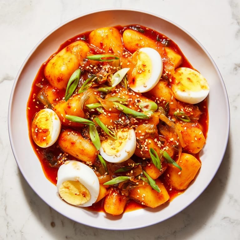 Save to Pinterest My first bowl of tteokbokki came during a rainy Seoul afternoon when I ducked into a street vendor's tent and watched her stir a pot of glossy, crimson rice cakes with the kind of confidence that only comes from making something a thousand times. The aroma hit me before I even sat down—gochujang, garlic, and something deeper I couldn't name. I've been chasing that flavor ever since, and somewhere along the way, I figured out how to recreate it at home.