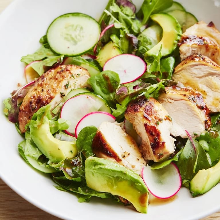 The combination of fresh vegetables, lean protein, and light vinaigrette provides nutrient density without heavy ingredients. Cucumber and radish are hydrating, while greens offer minerals and fiber.