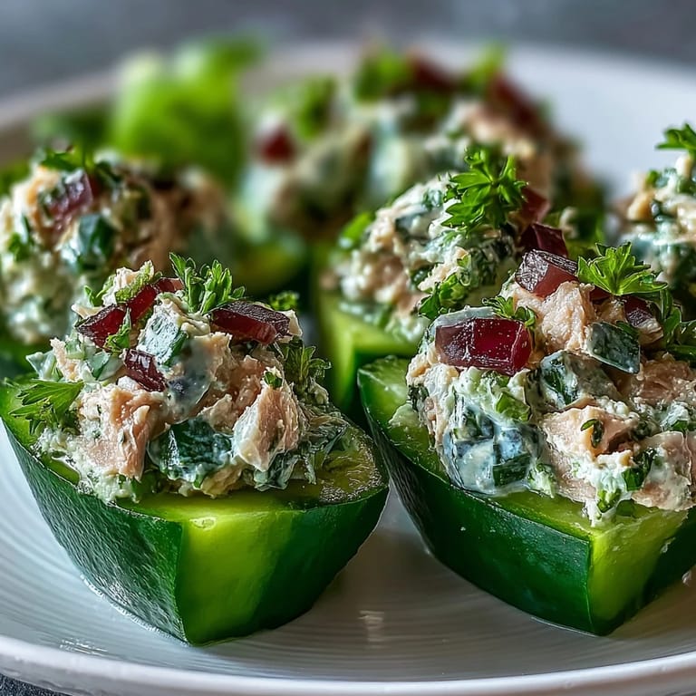 Save to Pinterest One afternoon, I was staring at my lunch options and realized I'd been eating the same sad desk salads for weeks. Then it hit me—why not hollow out cucumbers like little edible bowls? Within minutes, I had this vibrant tuna and avocado situation happening, and suddenly lunch felt like something I actually wanted to eat. No cooking, no fuss, just bright flavors and the satisfying crunch of fresh cucumber.